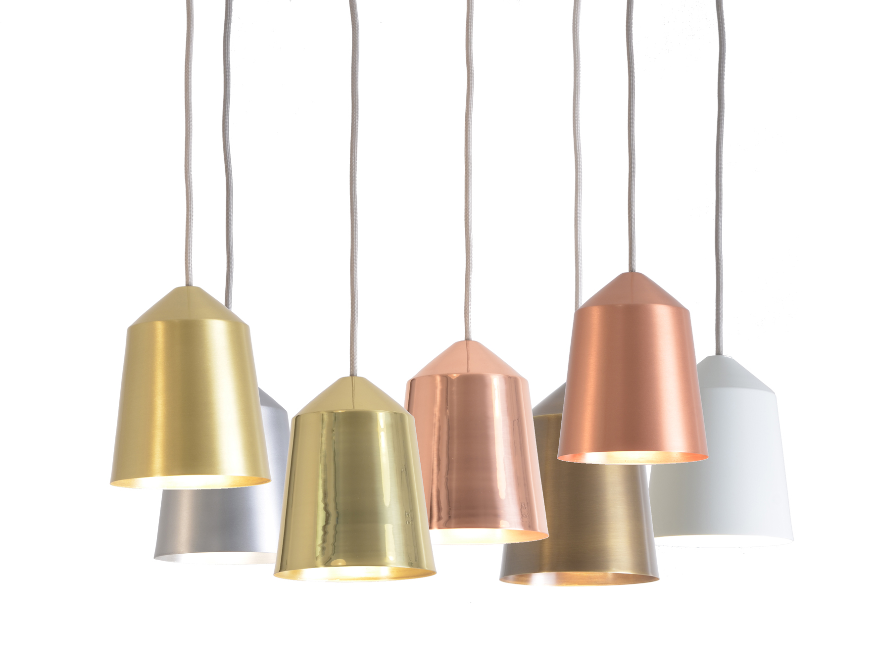 Cobre e alumínio com vários acabamentos no pendente Agogô de Cristiana Bertolucci