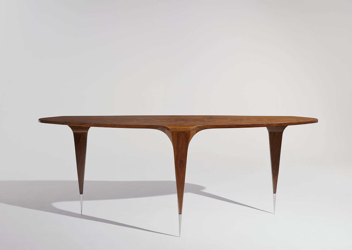 O aparador Cello (foto acima), lançamento, ergue-se do chão por meio de três pés afiados que lhe dão aspecto de um pouso de inseto. A peça tem um movimento contínuo e delicado em toda a sua estrutura.