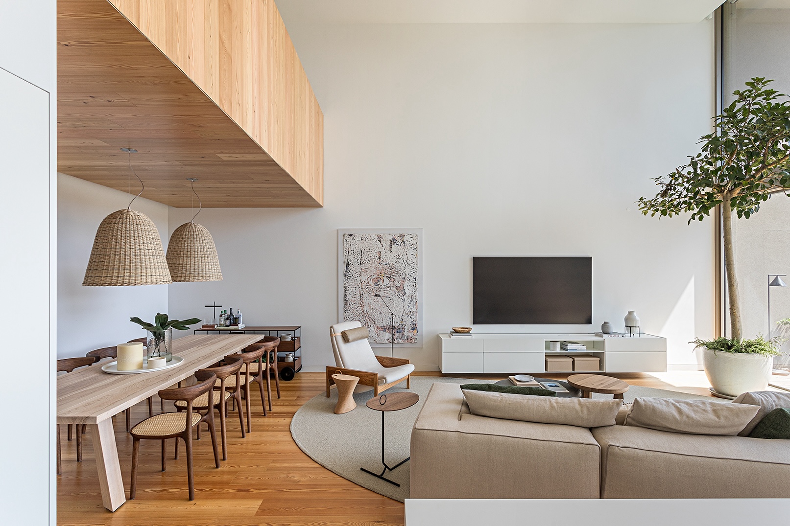 Para o projeto de interiores dessa casa contemporânea, a designer de interiores Marcela Peppe optou por usar madeira nos móveis, tons neutros e texturas variadas.