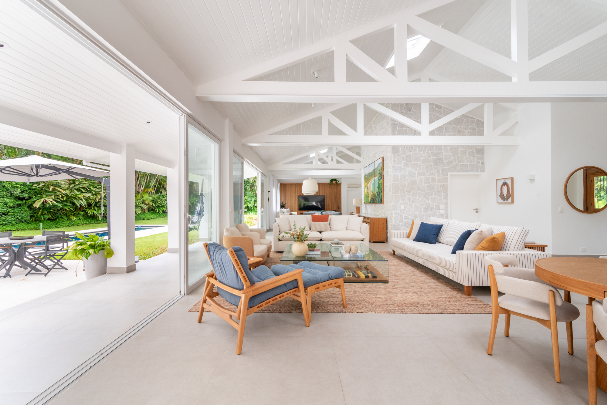 Uma casa leve, clara e fácil de usar. Esse foi o pedido dos clientes da arquiteta Julyana Bortolotto para a reforma desse imóvel de 550m2 na praia de Iporanga, no Guarujá