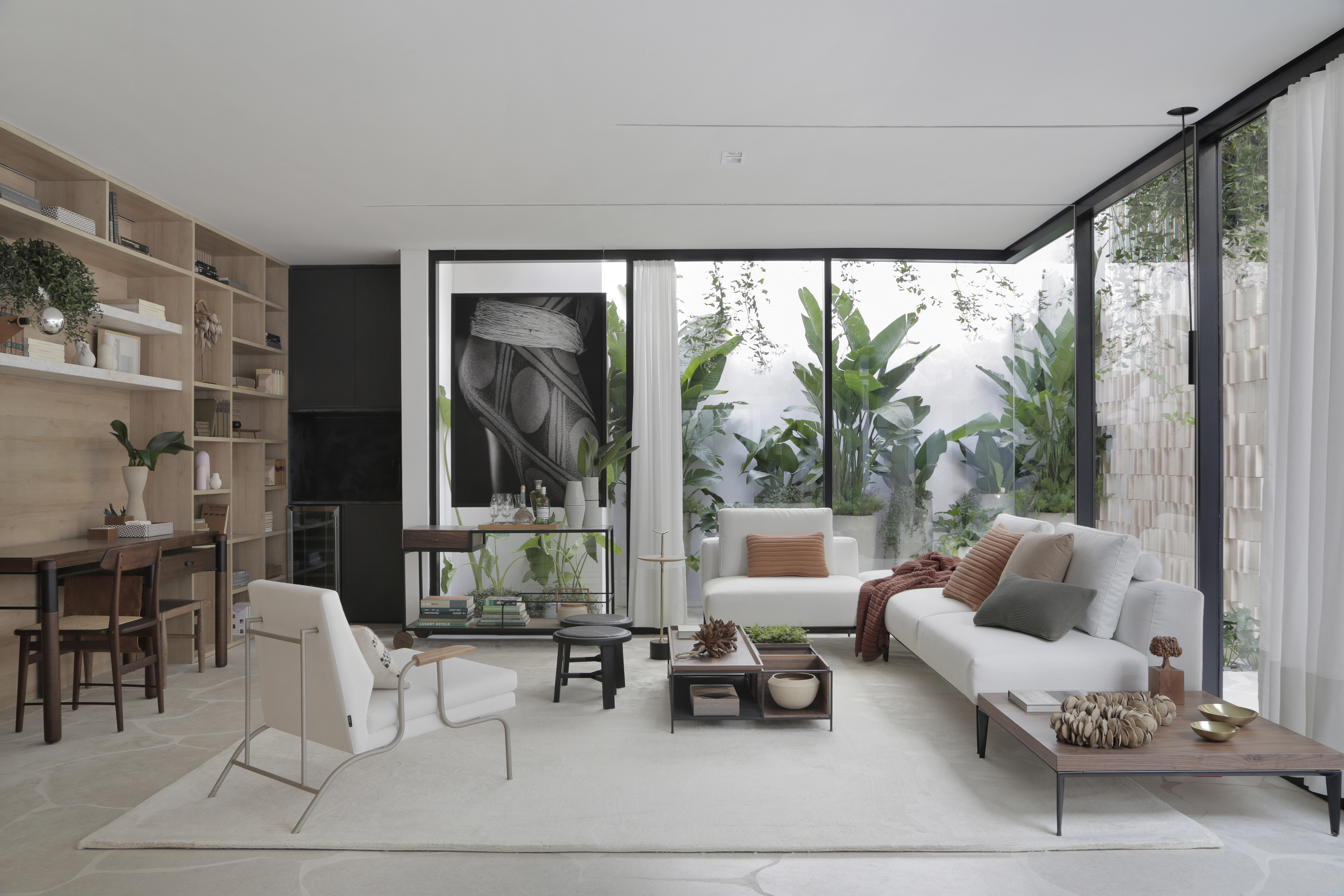 Cores claras e um jardim ao fundo compõem um ambiente de relaxamento, conexão e reflexão, proposta da Casa Conecta, espaço da arquiteta Ticiane Lima na Casa Cor São Paulo 2019.