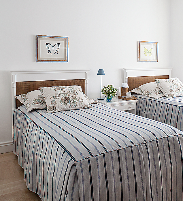 Aquarelado de Stella Crissiuma, com moldura azul e branco, dá um toque delicado na decoração do quarto