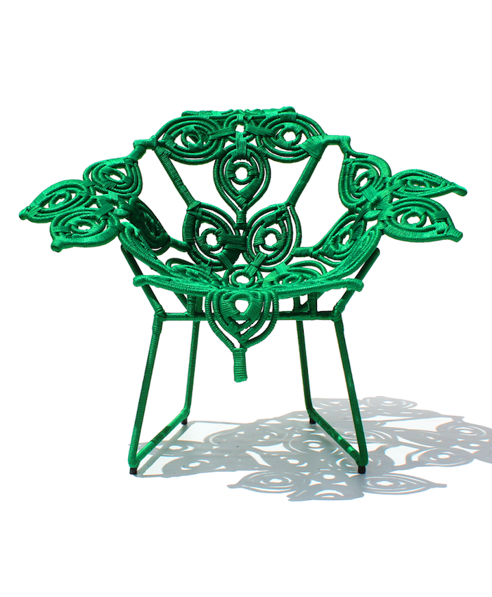 A cadeira Chita, do designer paraibano Sergio Matos, tem o aço como estrutura e a amarração em corda que recobre o desenho das flores. As peças traduzem a relação afetiva do designer pela cultura nordestina e privilegiam técnicas artesanais que as tornam únicas.
