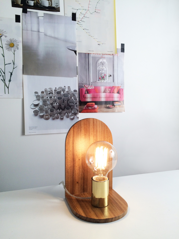 Produzidas em freijó e latão, as luminárias levam um charme único para espaços internos como quartos e escritórios. As peças possuem h 22 cm x L 14 cm e lâmpada de filamento de carbono.