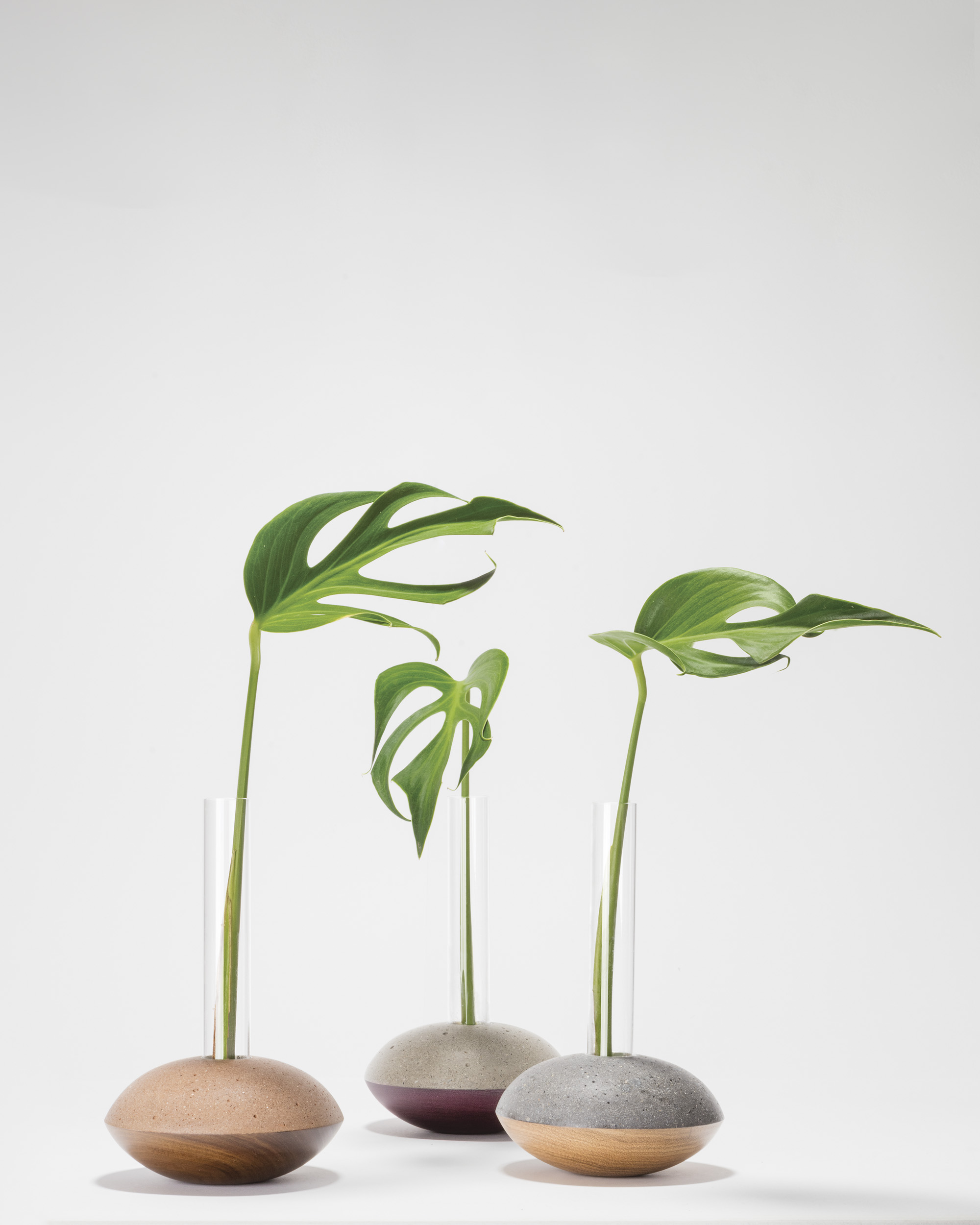 O vaso Bem Casado, assinado por Claudia Moreira Salles (foto principal) é fabricado em madeira e concreto e foi originalmente pensado como um castiçal.