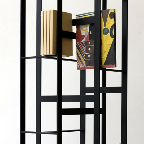 A estante tem estrutura de barras de aço inoxidável revestidas de borracha pintada (o que impede que os livros escorreguem), que se cruzam e se sobrepõem em ângulos retos. Demais, não?