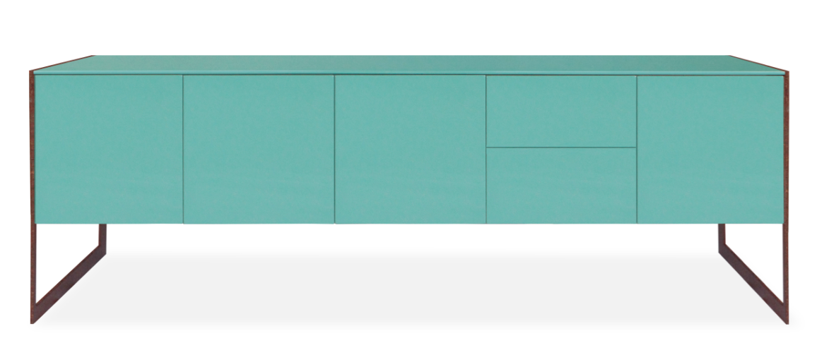 A Coleção AC é toda geométrica e foi criada a partir de chapas de aço Corten e painéis de madeira natural. As peças, como mesas de jantar, mesas de centro, aparadores, bufês e móveis de apoio com portas e gavetas, recebem acabamento em madeira ou laca brilhante.