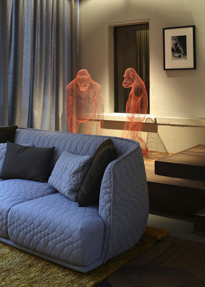 Na entrada do Das Stue – sala de estar, em alemão – uma mandíbula de réptil gigante dá as boas-vindas. Pelos corredores, chimpanzés e girafas feitos de arame de galinheiro (assinados pela artista italiana Benedetta Mori) convivem harmoniosamente com o mobiliário retrô-moderno. Foi assim que a designer Patricia Urquila, que divide o projeto do hotel boutique com os arquitetos catalães da LVG, homenageou os animais do zoológico municipal de Tiergarten, vizinho do hotel.