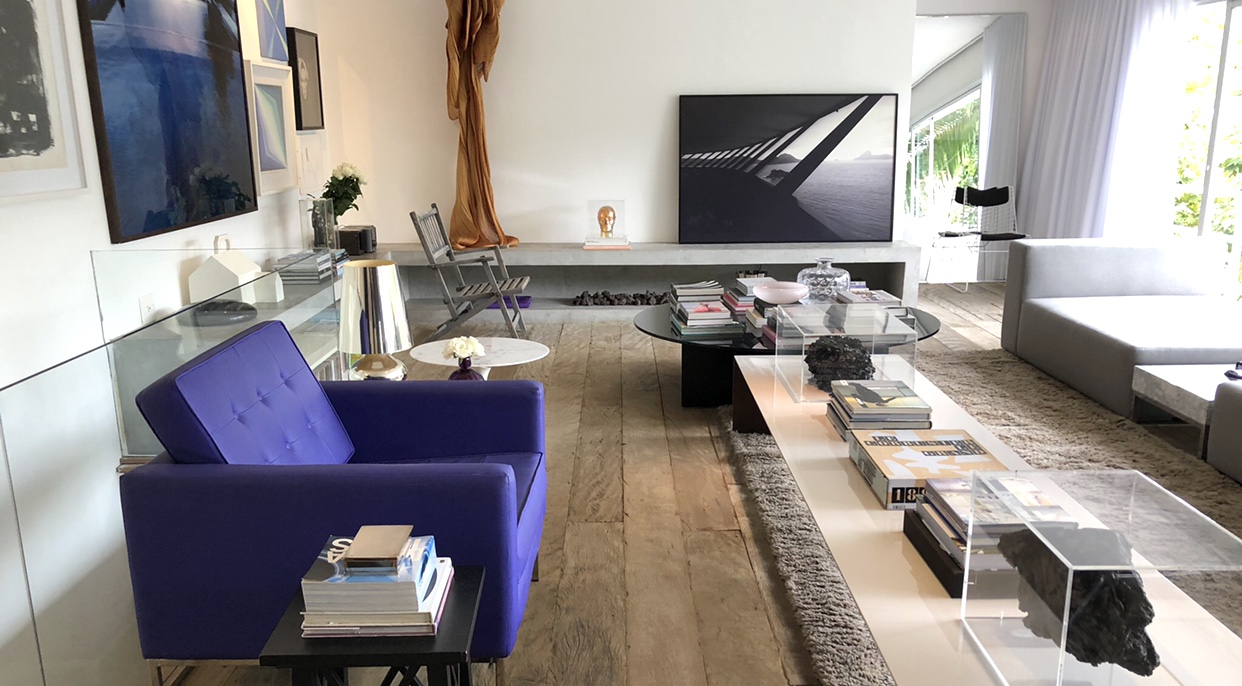 Calio mora e trabalha em uma casa em São Paulo. Uma construção dos anos 60 que, após uma reforma, ganhou ares contemporâneos e se transformou em uma caixa branca com uma decoração minimalista, móveis de linhas retas e peças de design onde predominam as cores cinza, preta e roxa, púrpura, a preferida do designer. O living, iluminado pela varanda, tem piso de madeira de demolição e uma produção de objetos e obras de arte muito bem cuidada.
