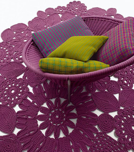 Os móveis da linha são uma explosão de cores e a matéria-prima continua sendo a corda com nós e tramas largas, em rosa, verde, amarelo e azul, além de tons terrosos que remetem a um resgate à natureza. Esplendoroso!