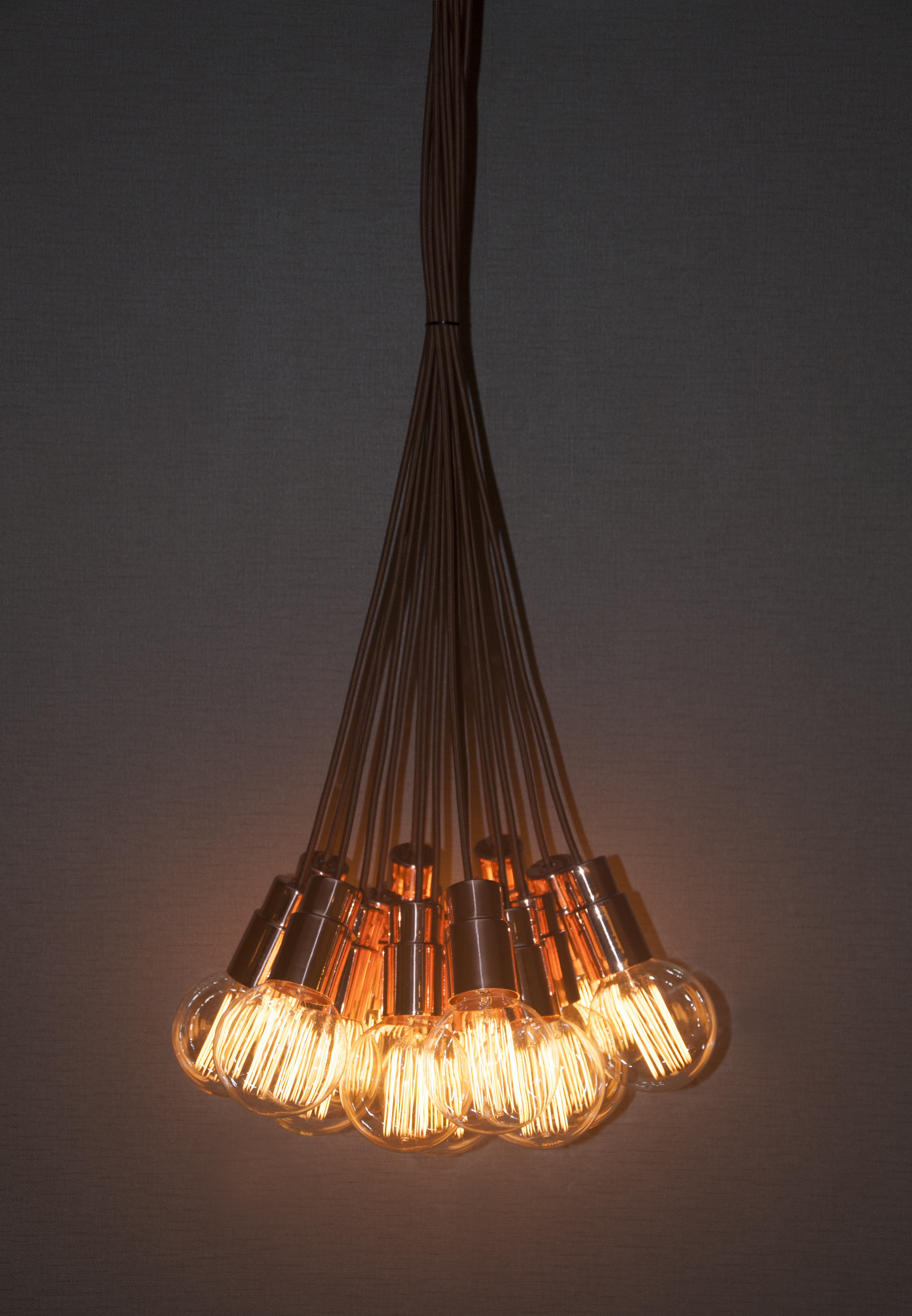 Rame, cobre em italiano, a peça é elaborada neste metal, com lâmpada de filamento modelo Tradicional ou Balão. O pendente pela sua versatilidade pode ser composto em vários formatos que proporcionam ao ambiente um cenário singular.