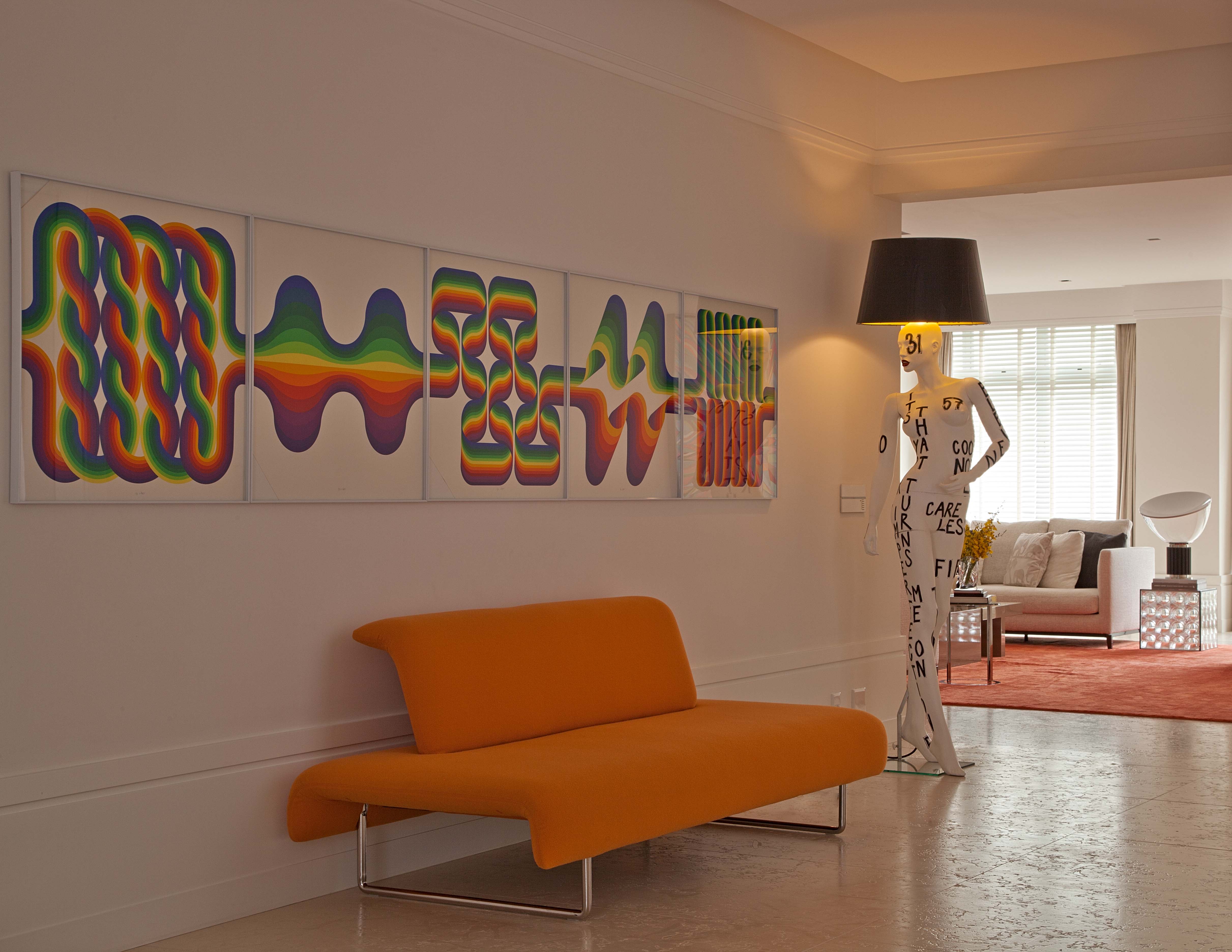 Neste apartamento, o casal quis buscar as peças de que mais gostava em Londres, a cidade que Zize ama loucamente. E lá foram os três atrás do espírito londrino, que se traduziu em um luminoso apartamento, salpicado de tons laranja.