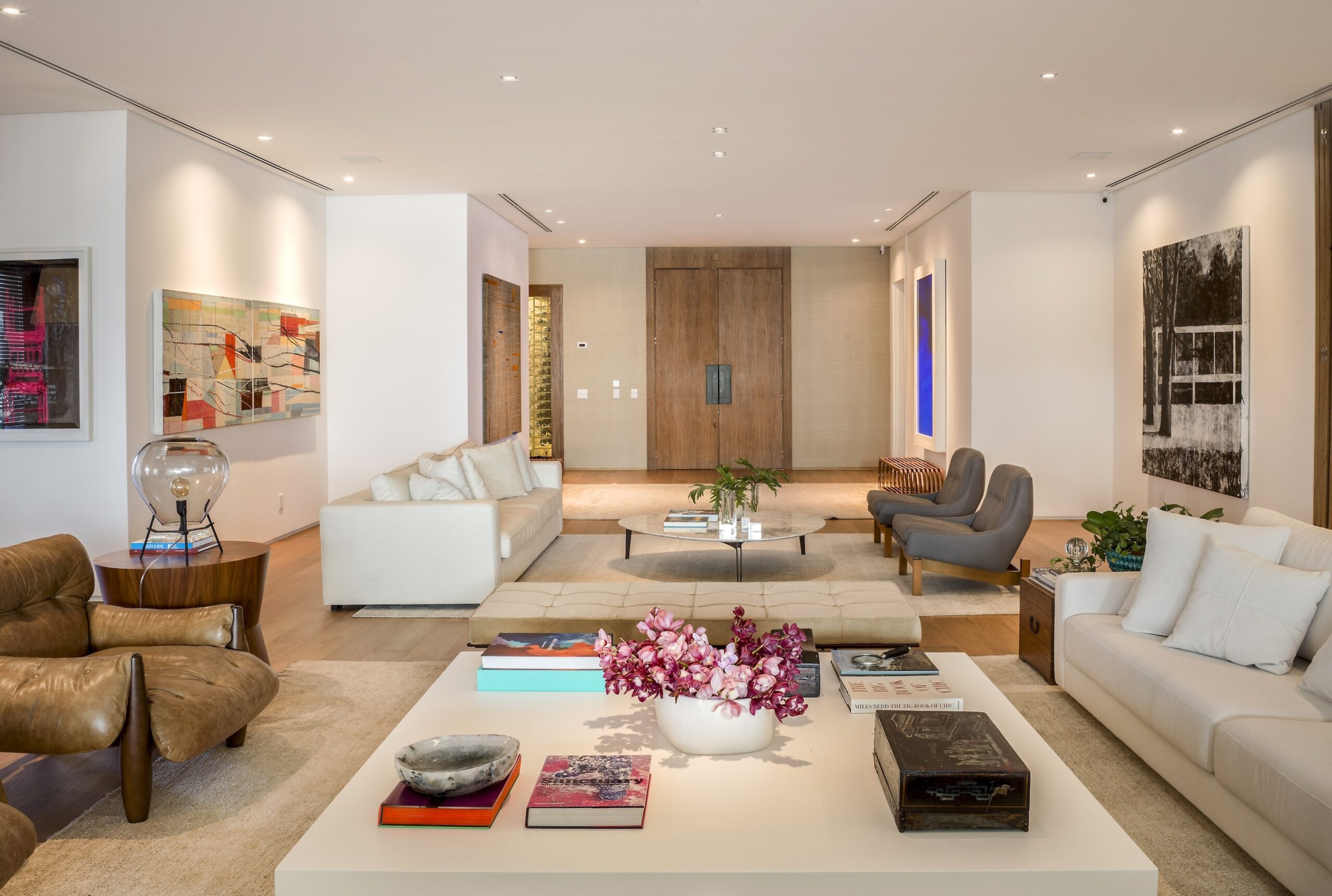 Uma galeria de arte recebe os visitantes na entrada do apartamento e dá acesso ao amplo living dividido em dois ambientes de estar. Duas obras de arte escolhidas a dedo para o local valorizam o primeiro plano do extenso living com iluminação suave, pé direito de 2,80m, ladeado pela sala de jantar e pelo Home Theater.