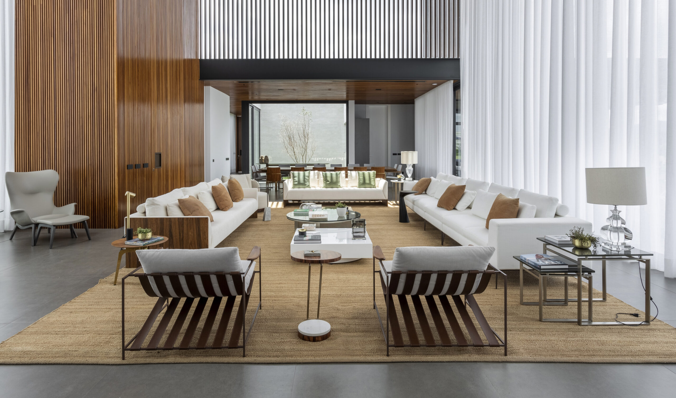 Um dos destaques do projeto é o pé direito de 8 metros com vidros piso teto que aumentam a transparência e a luminosidade da casa. A integração dos ambientes foi um pedido dos proprietários. Área social e piscina conectadas, com mobiliário pensado para receber muitos amigos.
