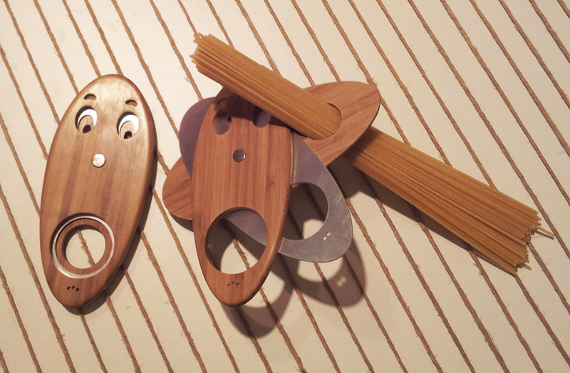 O Pazzo é um dosador de espaguete feito com material reciclável: alumínio e bambu de manejo sustentável. Seu propósito é estimular o consumo consciente de forma divertida e lúdica. As doses ajudam a estabelecer parâmetros quantitativos para o usuário preparar a sua refeição sem exagerar na porção.
