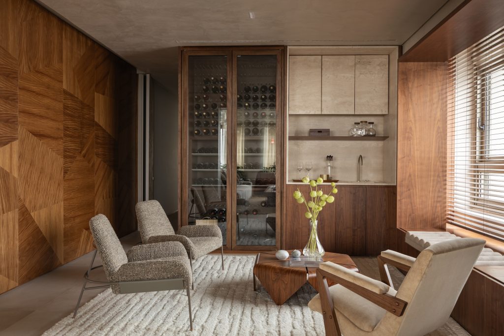 “Vale ressaltar os ambientes de copa com a ilha orgânica conectando a cozinha de cor verde, o painel do volume central em marchetaria e o ambiente de adega com tramas e texturas acolhedoras” conclui o arquiteto.