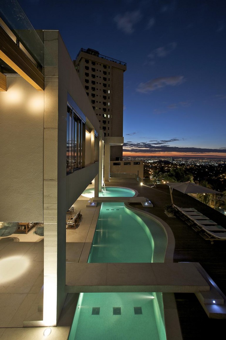 A casa, de 1.430 m² de área construída, conta com uma arquitetura arrojada, onde o uso de linhas retas e elementos de impacto como pórticos e passarelas garantem um conjunto arquitetônico harmônico e inédito.