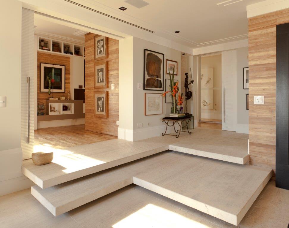 Mara aproveitou os desníveis do projeto original e criou no piso patamares suaves que integram a entrada ao living e à sala de jantar, espaço que perdeu o ar formal e se transformou em uma sala despojada, com um canto de televisão para o dia a dia da família.
