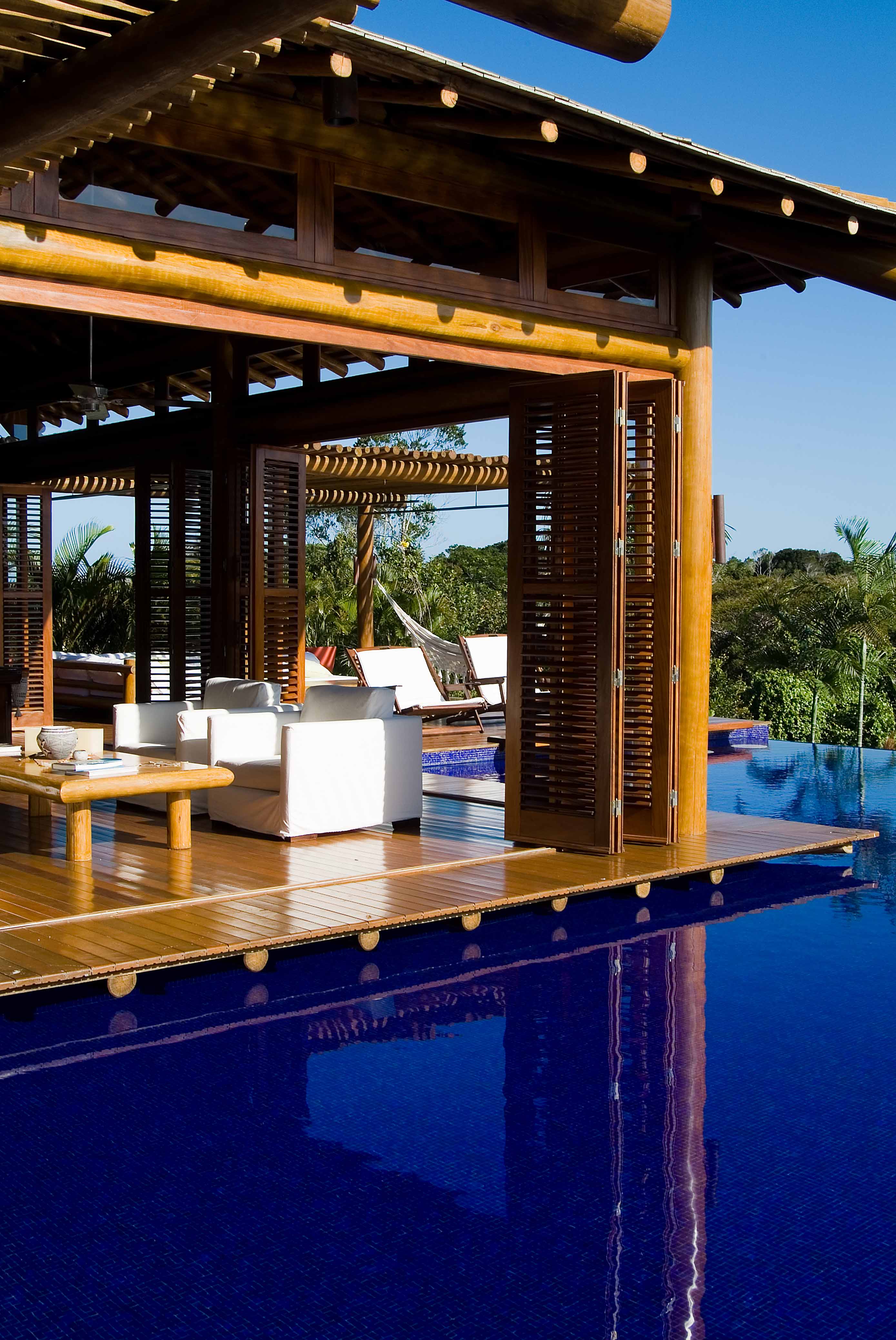 O arquiteto David Bastos possui a habilidade de explorar a beleza da madeira como poucos. Neste projeto na porção sul do ensolarado litoral baiano, as toras densas de eucalipto acolhem as telhas de pinus, as portas-venezianas de peroba, o deck de cumaru.