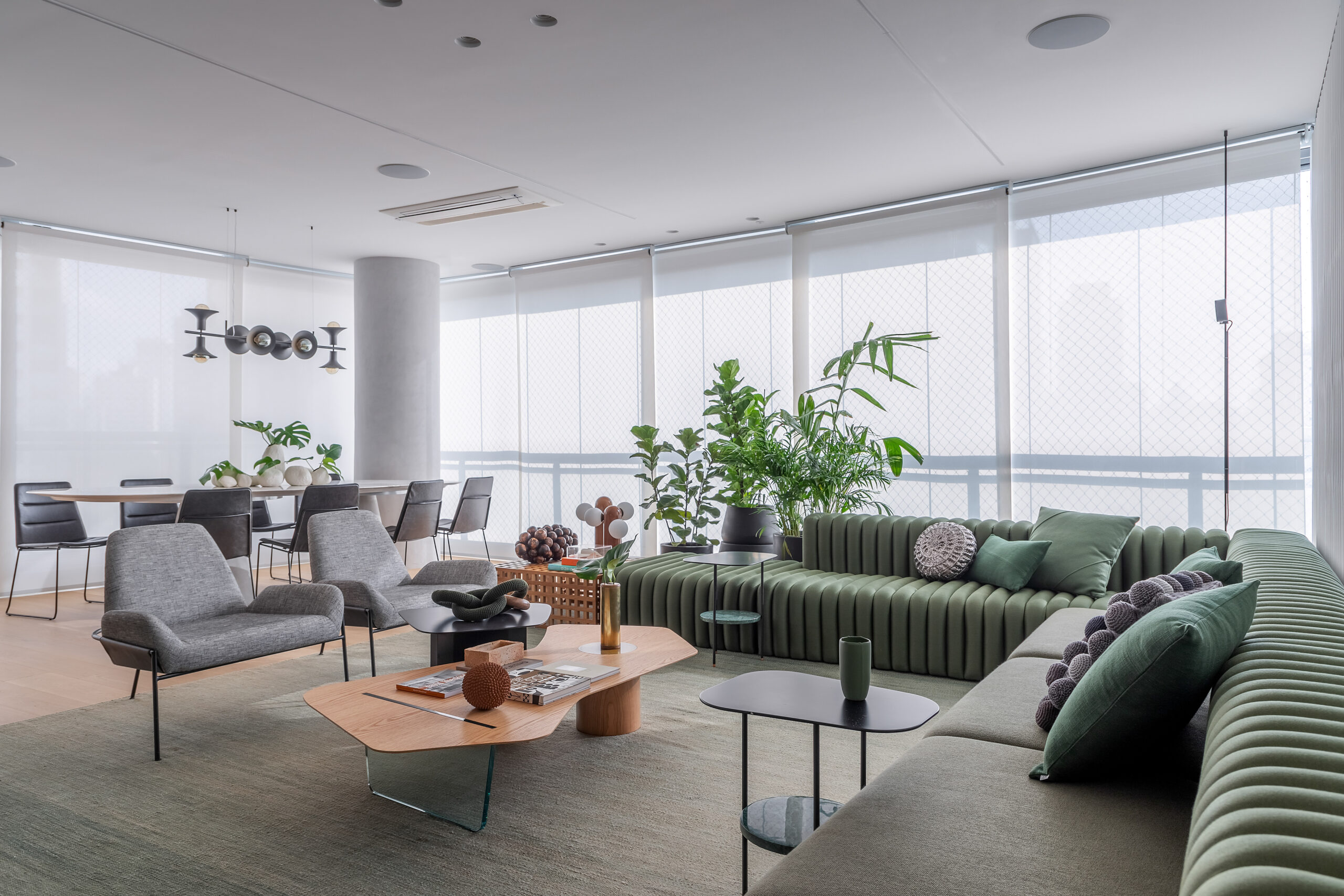 A sala tem um sofá em L com 5m de cada lado e duas poltronas Lina, além de uma linda adega para 270 garrafas, que ganha ainda mais charme por estar em frente a um painel de Carvalho Europeu. Na parede maior do living, Beatriz colocou placas cimentícias onduladas. “O desenho côncavo conversa com os gomos do sofá, que são convexos, e a pintura branca dá claridade”, afirma a arquiteta.