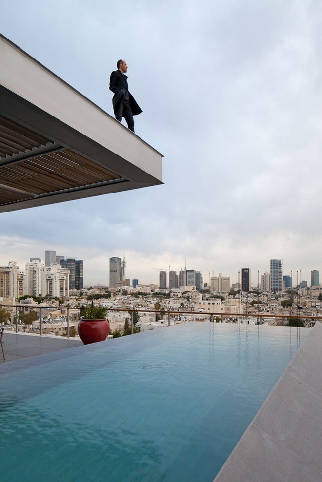 A área externa é convidada a entrar nesta cobertura israelense. E a piscina dá um show à parte