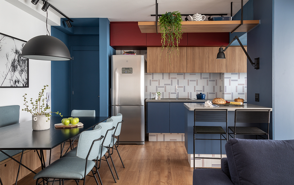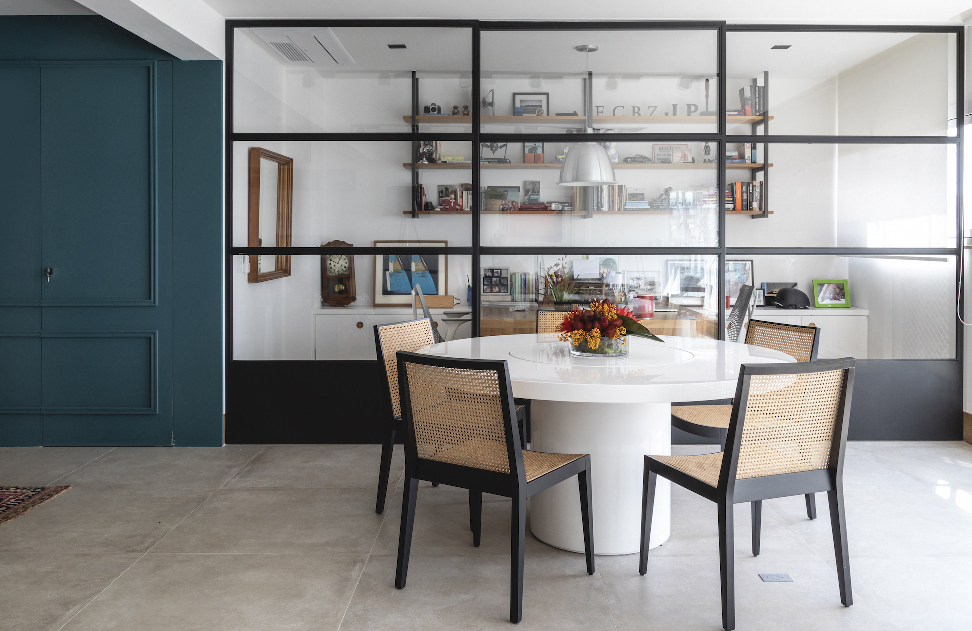 A designer de interiores Marina Linhares adequou a rotina do marido ao dia a dia da família, integrando a cozinha/escritório à sala de jantar.